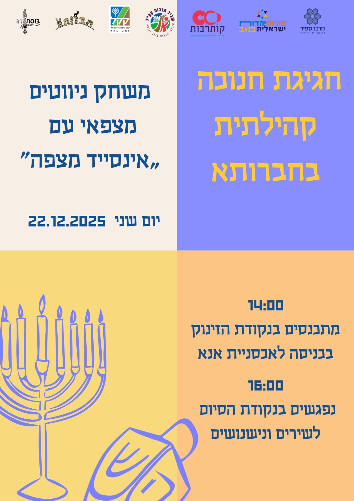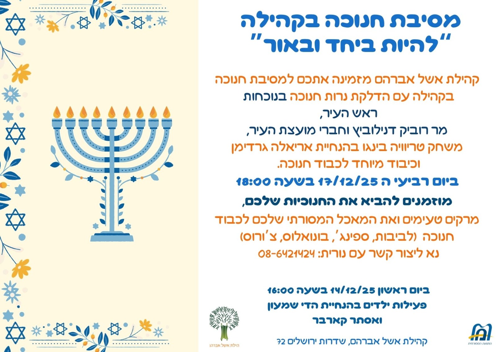 נתכנס באווירת החג להיכרות, נשנושים והדלקת נרות קהילתית משותפת.