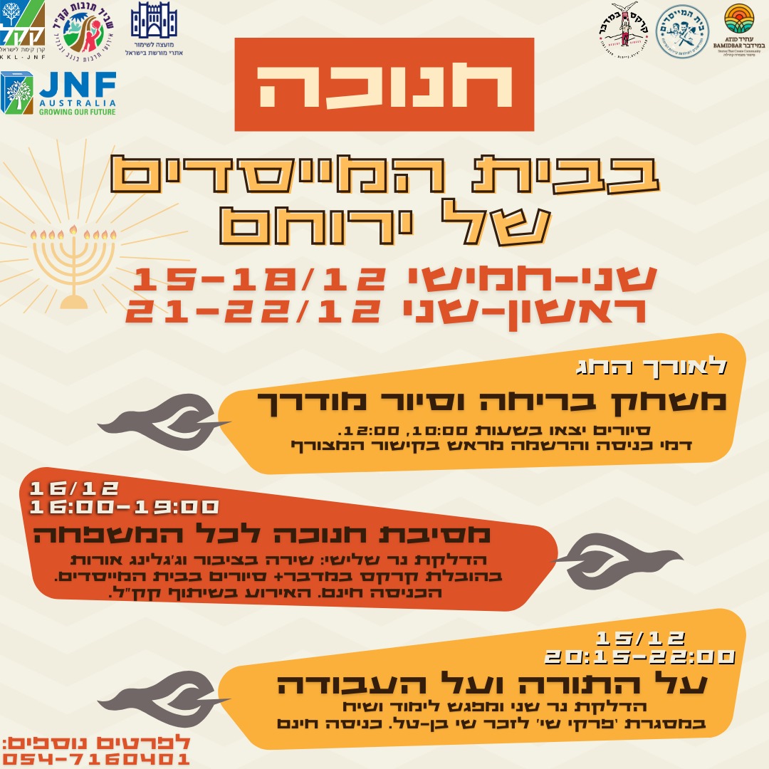 סיורים בבית המייסדים משעה 16:00; הדלקת נר שלישי, שירה בציבור וג'גלינג אורות בהובלת "קרקס במדבר" משעה 17:30. הכניסה בחינם. האירוע בשיתוף קק"ל.